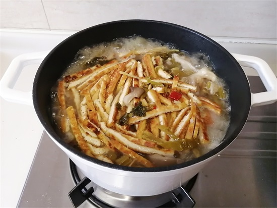 13、放入油豆腐丝,盖上盖子,中火炖20分钟。中火可以让汤更浓郁,各种味道更加快速的融合。