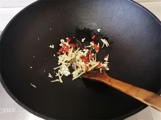 8、花椒、麻椒炒香后,下入蒜末、泡椒圈和姜丝,中小火煸炒出香味。