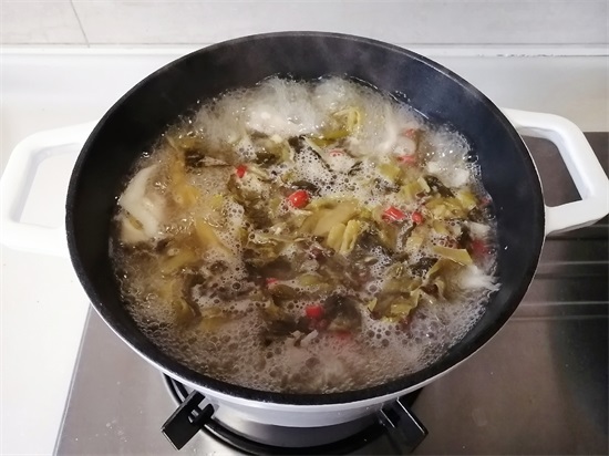 12、接着加入炒香的酸菜。
