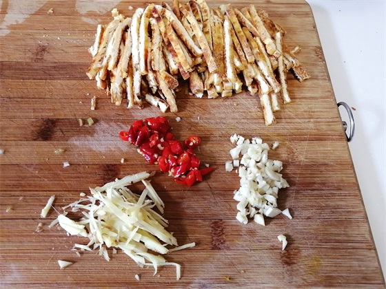 3、把油豆腐片切成丝,泡椒切小圈,蒜切蒜末,姜切成细丝。