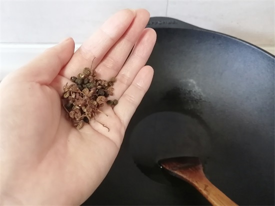 7、煎鱼的同时,另外起一口炒锅,加入适量的猪油,放入少许花椒和麻椒,小火煸出香味。