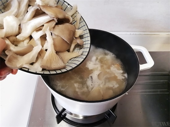 ④平菇的加入可以使汤味更鲜美,喝汤也很美味,加金针菇也是可以的。