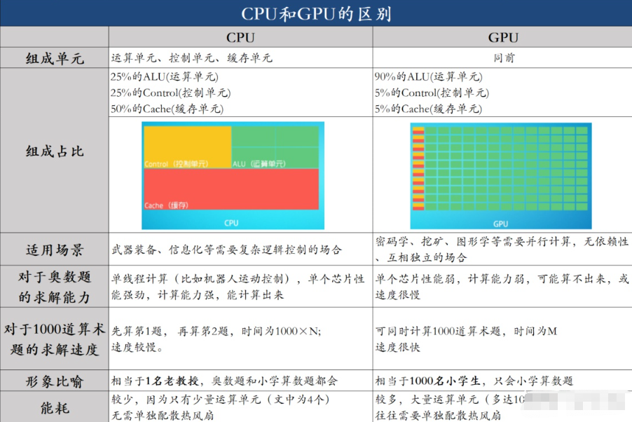 GPU:只可以计算简单的1+1算术题,不能计算复杂的微分积分,1000个运算单元属于小学生水平。