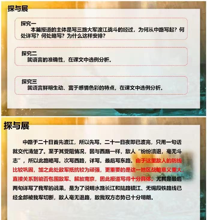 渡江战斗于二十日午夜开始,地点在芜湖、安庆之间。国民党反动派经营了三个半月的长江防线,遇着人民解放军好似摧枯拉朽,军无斗志,纷纷溃退。长江风平浪静,我军万船齐发,直取对岸,不到二十四小时,三十万人民解放军即已突破敌阵,占领南岸广大地区,现正向繁昌、铜陵、青阳、荻港、鲁港诸城进击中。→(主体)