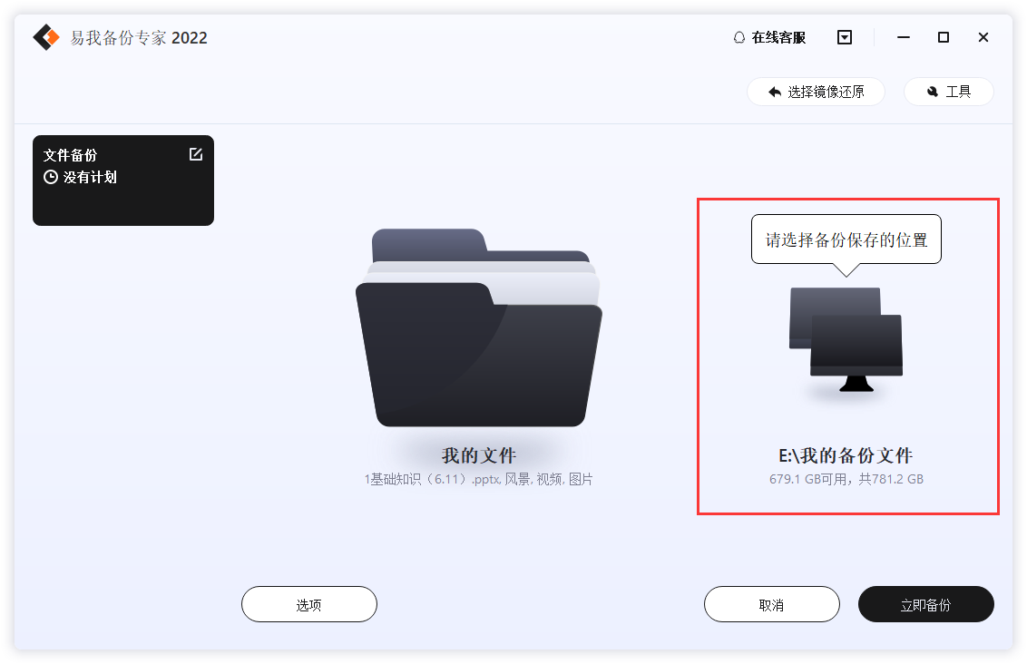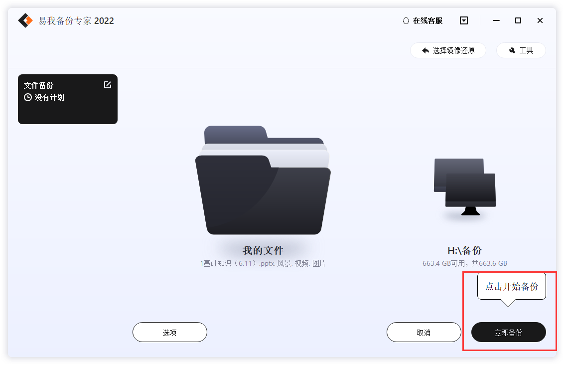 如果你对备份有更高的要求,可以在备份前,点击“选项”进行个性化设置,关于这些高级功能的详细介绍,请访问易我备份专家用户指南!
