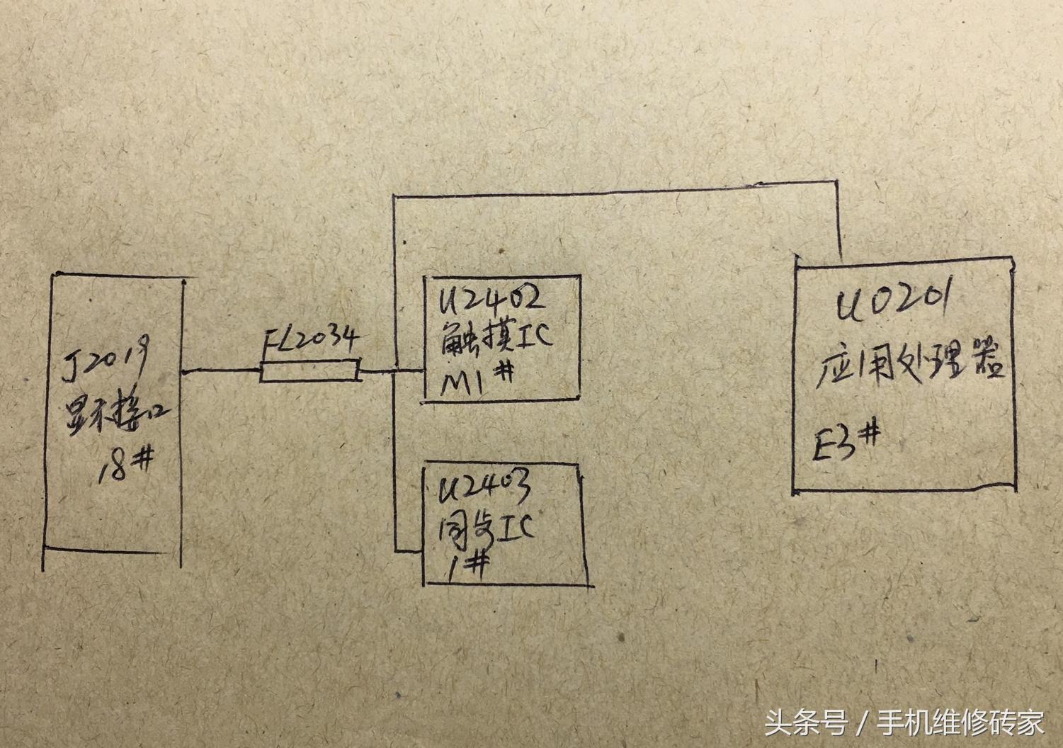 维修一个故障时,首先要懂得它的工作原理,iPhone 6plus 触摸失灵,打开电路原理图,从维修经验分析得知,这是显示多路同步动态控制信号出现问题。CPU u0201的e3脚输出LCM_TO_AP_HIFA_BSYNC_BUFF控制信号,分别送给触摸IC u2402的m1脚和同步控制IC u2403脚,然后经fl2403送到显示接口j2019的18脚,实现显示和触摸动态同步控制,从而避免显示和触摸无法同步工作,通俗的讲,就是显示屏点亮后,同时要能够触摸,他们相互之间的关系,我简单画了一幅框架图来呈现。