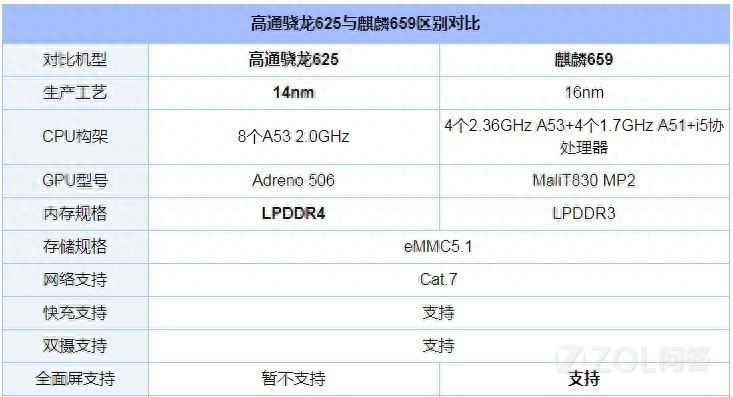 从参数对比来看,骁龙625和麒麟659各有优势,两者相同的地方在存储、网络、双摄支持,不同的地方则在于骁龙625有着更先进一些的工艺,支持LPDDR4内存,而麒麟659则支持全面屏。