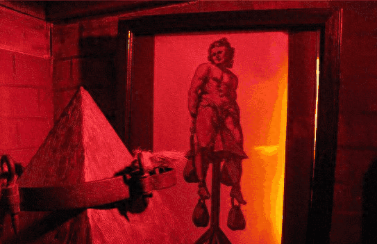 犹大吊篮这种邪恶的酷刑器具是宗教法庭用来折磨异端并逼供的。它是一个金字塔形的凳子,上方悬挂着滑轮和绳索。