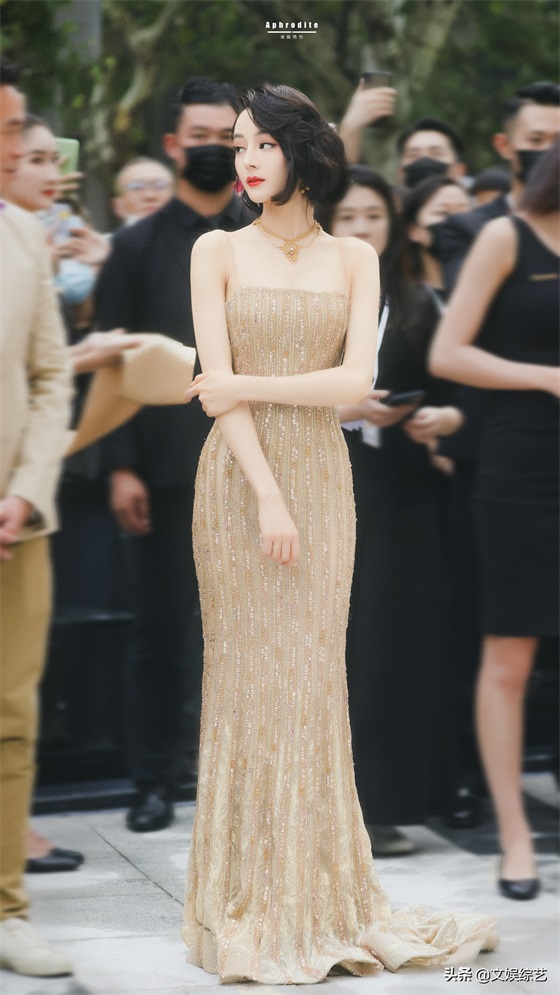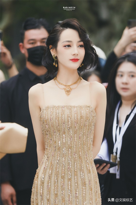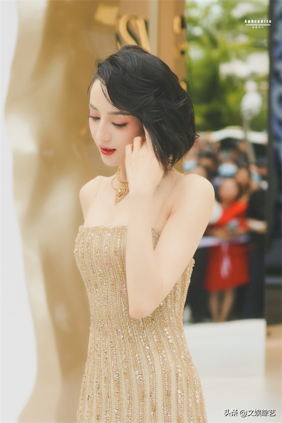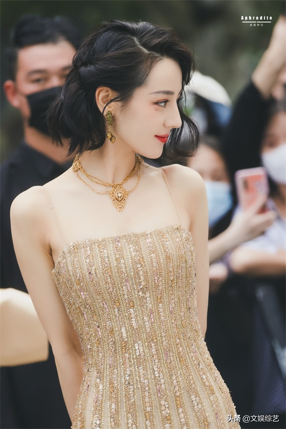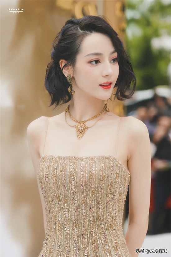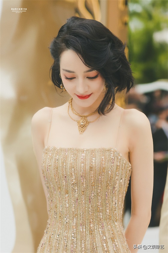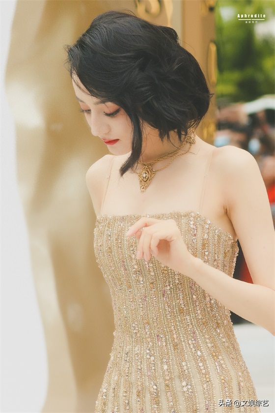 迪丽热巴这组穿搭,一头乌黑的短发,淡淡的眼妆,一身金色吊带礼服,嘴角微微一笑,让人看一次就心动一次。