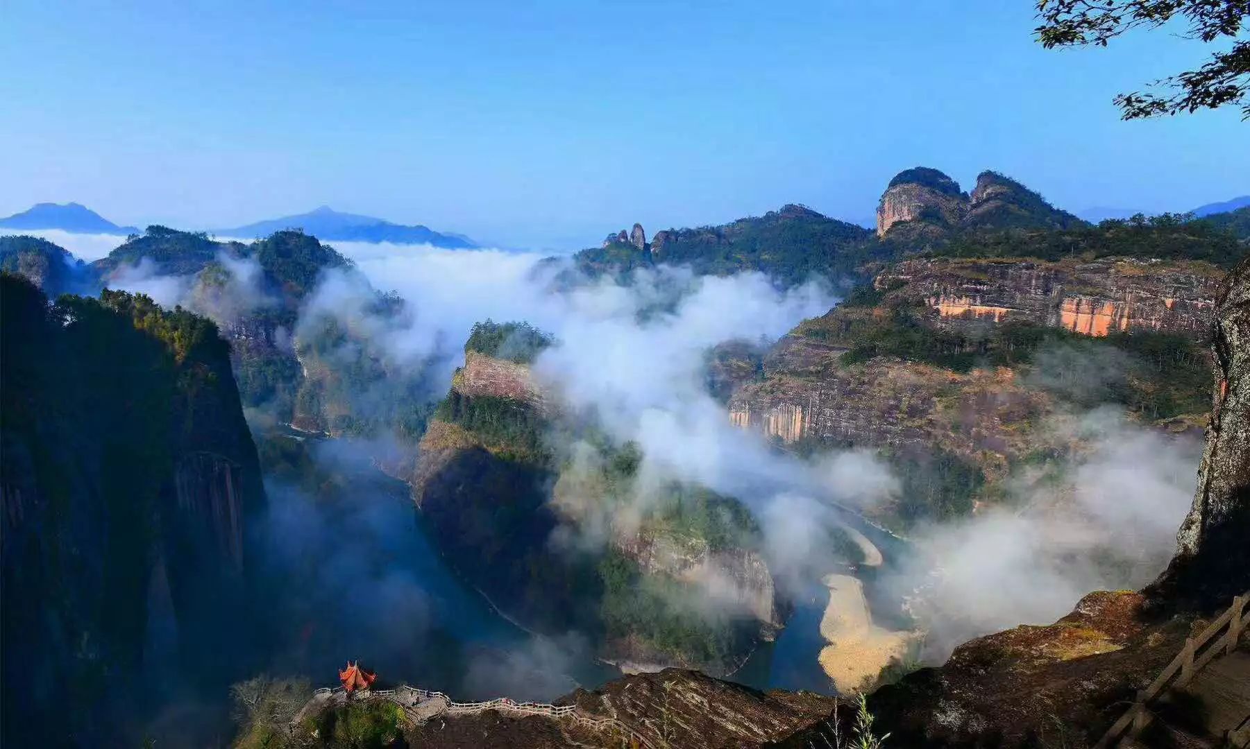 武夷山,武夷山位于江西与福建西北部两省交界处,武夷山脉北段东南麓总面积999.75平方公里,是中国著名的风景旅游区和避暑胜地。属典型的丹霞地貌,是首批国家级重点风景名胜区之一。武夷山自然保护区,是地球同纬度地区保护较好、物种较丰富的生态系统,拥有2527种植物物种,近5000种野生动物。