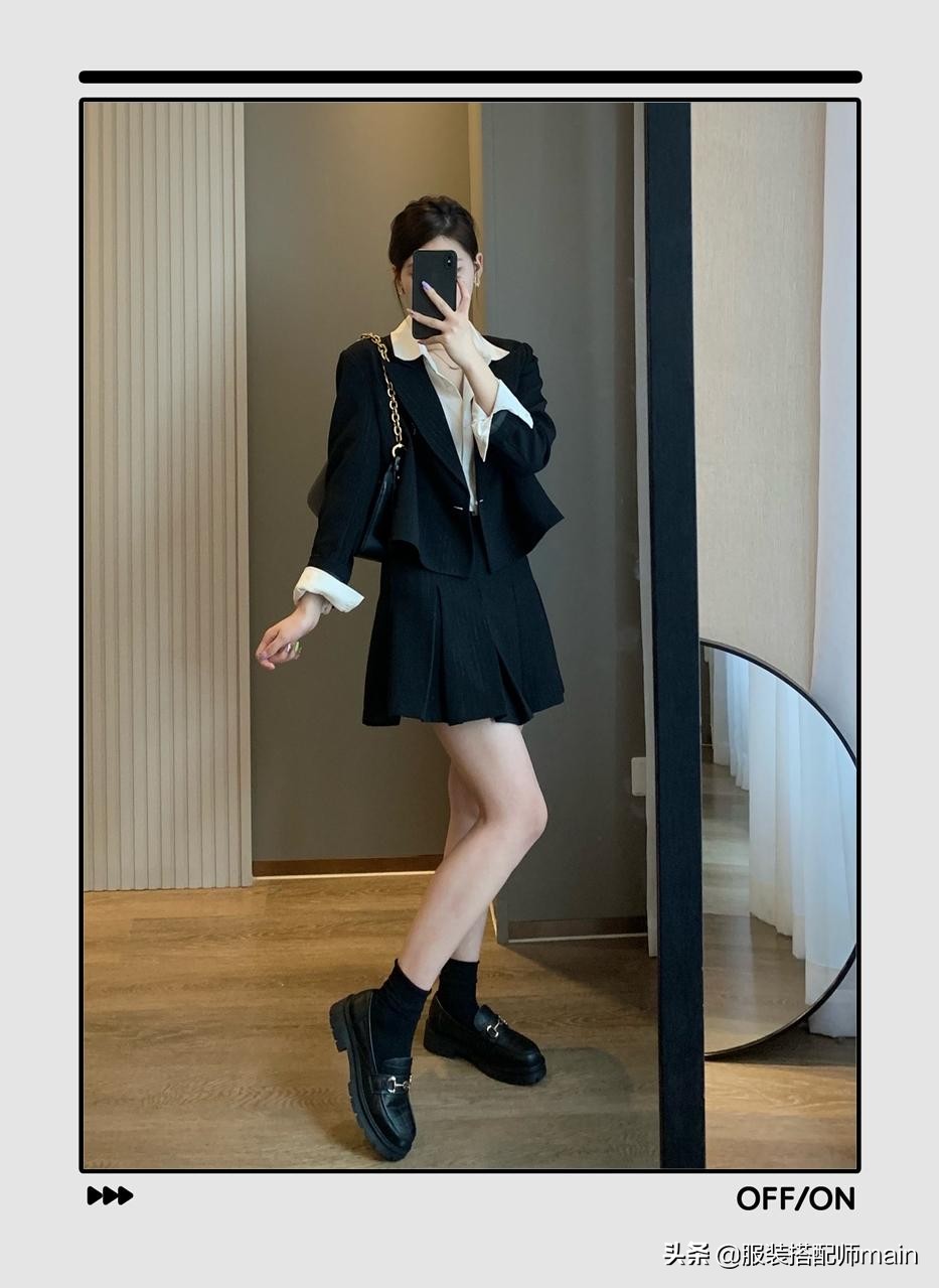 这么的搭,A字的版型,上身很显腿细,如果你的公司对着装要求不是很严格,这身套装真的可以试试。