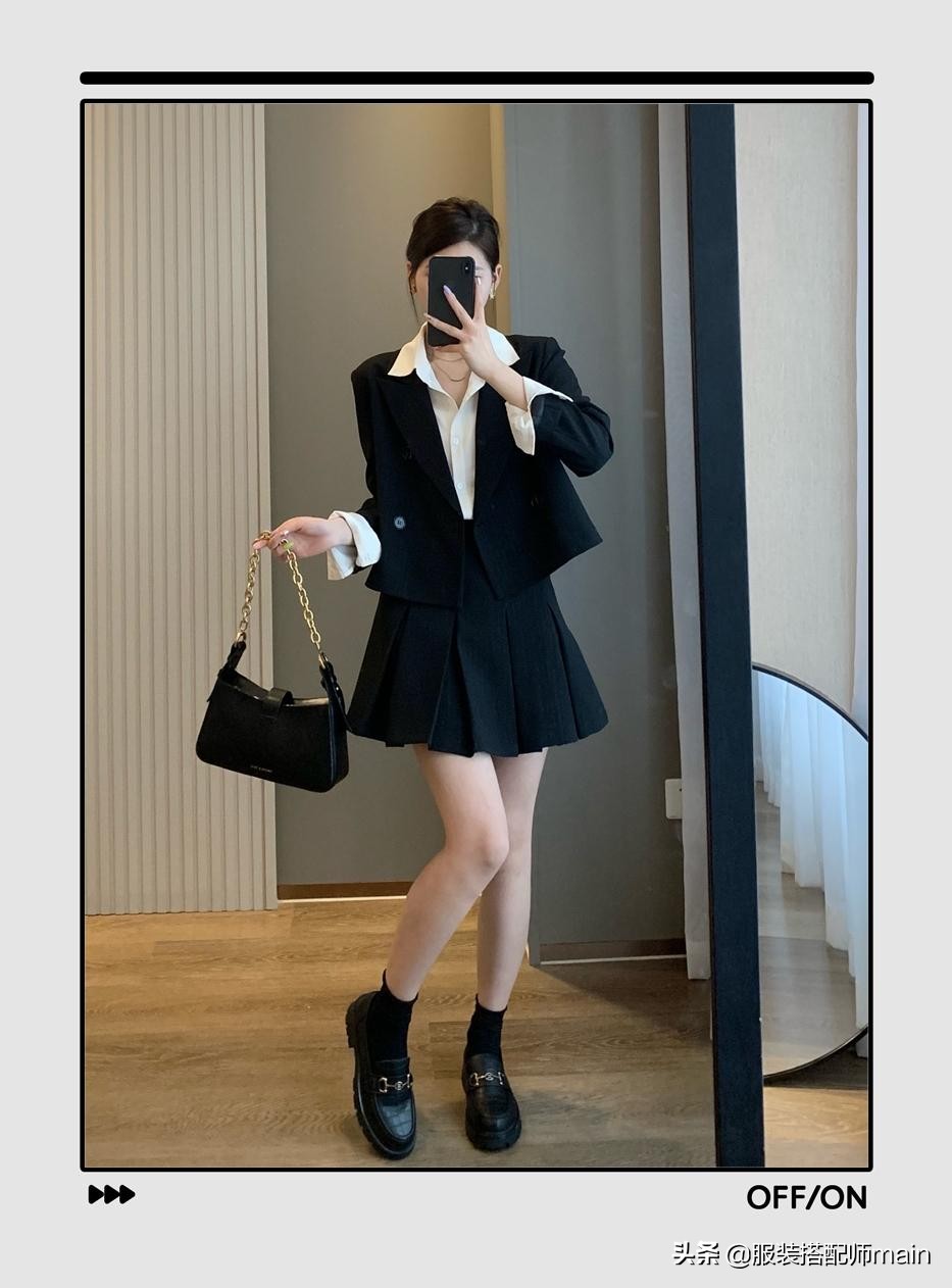 黑西装内搭白色衬衫,经典不出错。西装立体挺括有型,几乎适合各种身材的女孩穿,而且还很