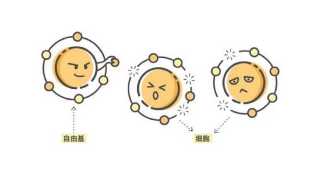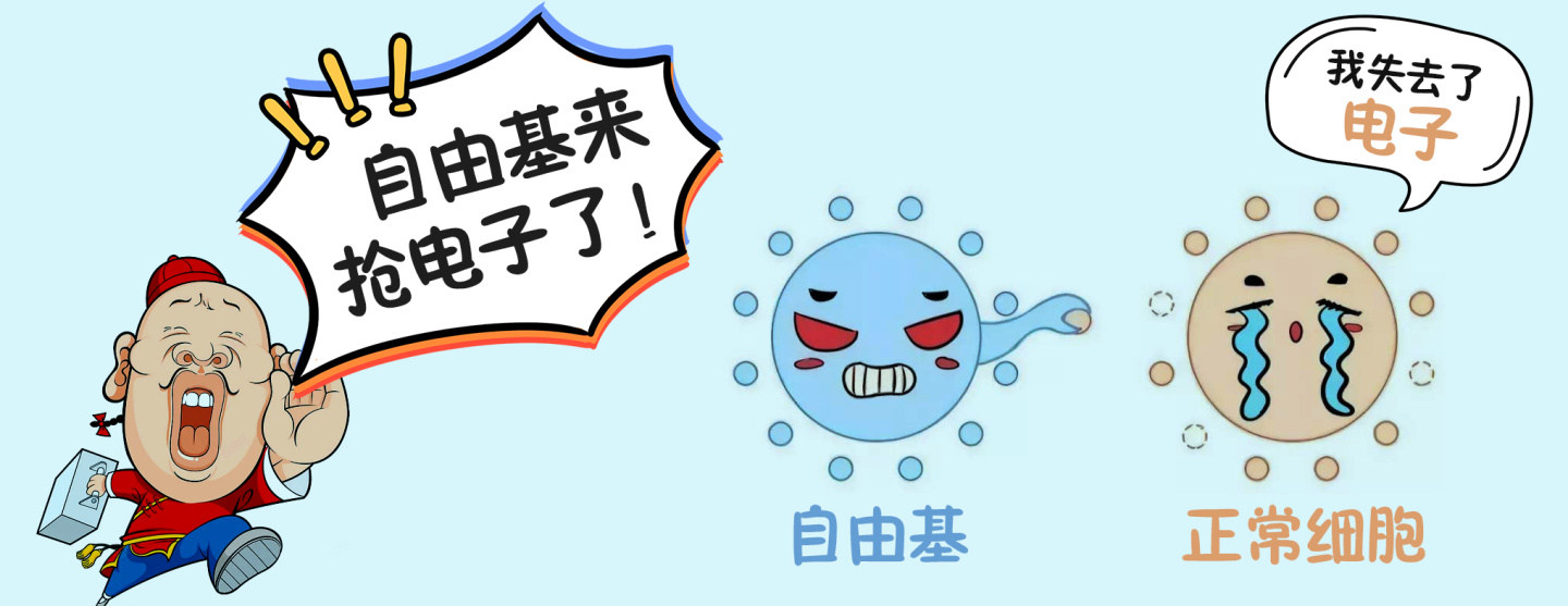 正常情况下,人体中的自由基处于平衡状态,适当的自由基对人体很多生理功能还发挥有重要作用。当体内自由基过多时,极不稳定的它们会从邻近分子中掠夺电子,使邻近分子变成新的自由基,从而发生连锁反应,导致自由基越来越多。