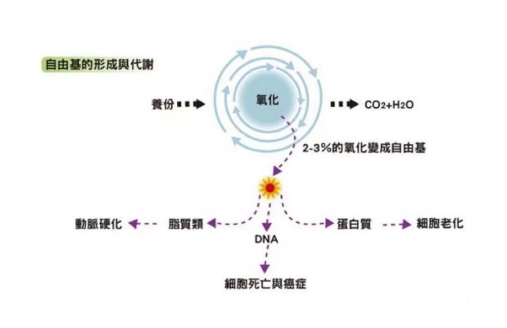 自由基,也叫“游离基”,指含有不成对电子的原子or基团,具有高活性。人体正常的新陈代谢,需要消耗氧气,这本身是一个氧化的过程,自由基就是代谢作用的副产品。