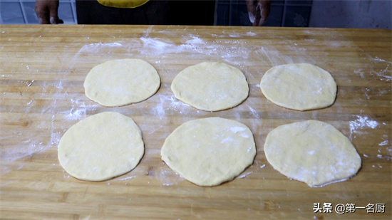 第二步.在案板上抹一层植物油,把面剂子一个一个地擀成薄薄的面片备用。