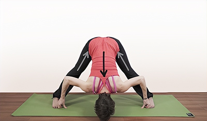 山式站立,做一个大的向后弓步。后脚外转45度。体重均匀分布在双腿上 呼气,以髋为折点,上半身向前向下,延展脊柱,双手放于脚两侧