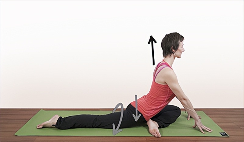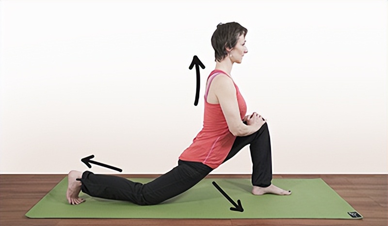 下犬式开始。将一条腿拉近腹部,转动腿,使膝盖朝外,然后以一定角度将其放在手前。 向后伸展的腿尝试一点内旋。保持骨盆中立,延展脊柱。