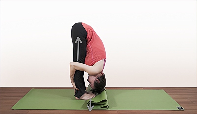 山式站立,通过稍微弯曲膝盖骨来锻炼腘绳肌。向前屈,将重心转移到前脚上 脚掌压入垫子,感受背部如何放松和拉长。手放在脚边。