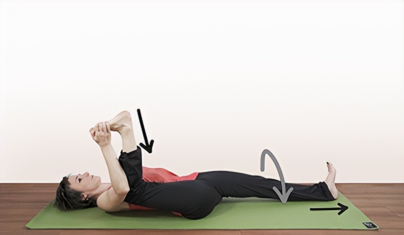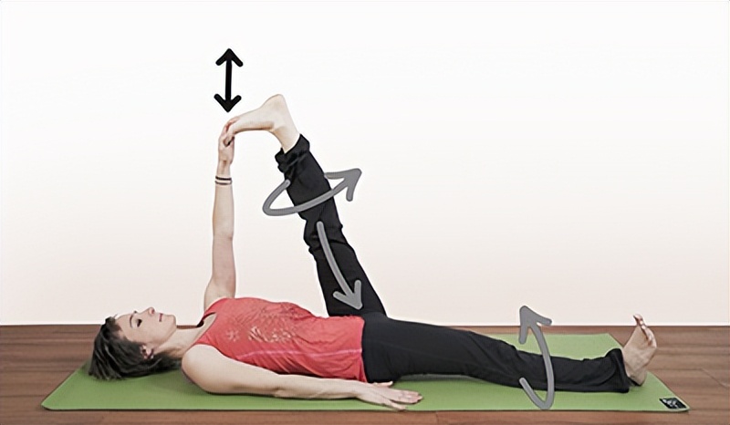 仰卧,双腿伸直。抬起一条腿,将大腿拉近躯干,用手抓住脚。小腿垂直于地面。 伸出的腿向内旋转,脚部回勾。保持五次呼吸。