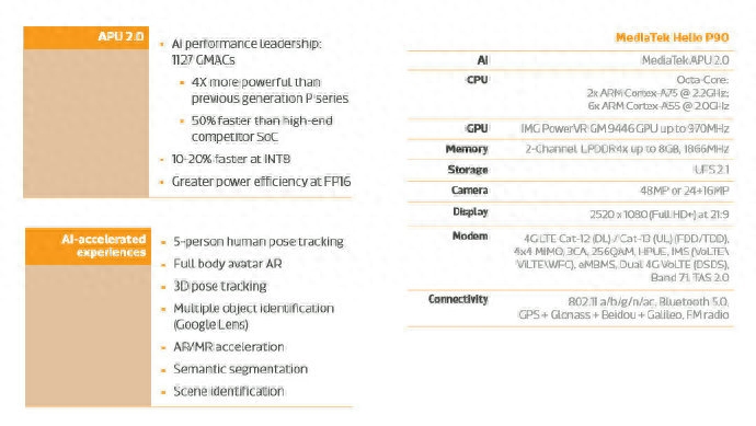 根据目前的信息,联发科Helio P90采用台积电12nm工艺打造,内置8核心CPU,分别为两颗2.2GHz的A75大核以及六颗2.0GHz的A55小核。并且在主打AI拍照性能,能够每秒拍摄30张4800万像素的照片或者480张1600万像素照片。