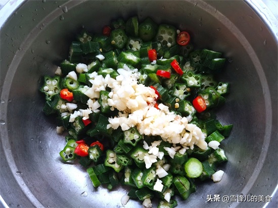 所用材料:黄秋葵适量,大蒜少许,小米辣2个,生抽1勺,米醋1勺,盐少许。