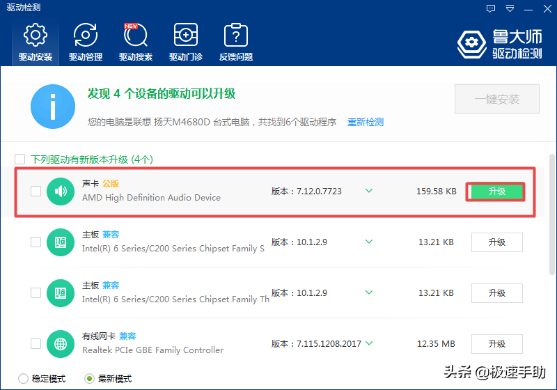 驱动检测成功后,我们看看检测出来的结果是不是声卡的驱动版本太低了,如果是的话,点击将声卡驱动进行升级一下试试看。