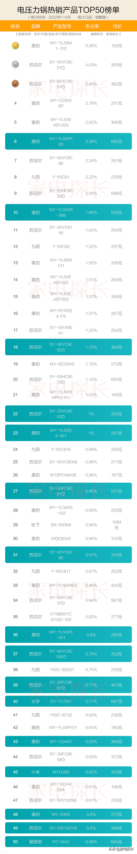 2022上半年,电压力锅TOP50热销机型,也基本被“美苏九”瓜分:美的上榜21个、苏泊尔19个、九阳6个,其它品牌合计只有4个入围。