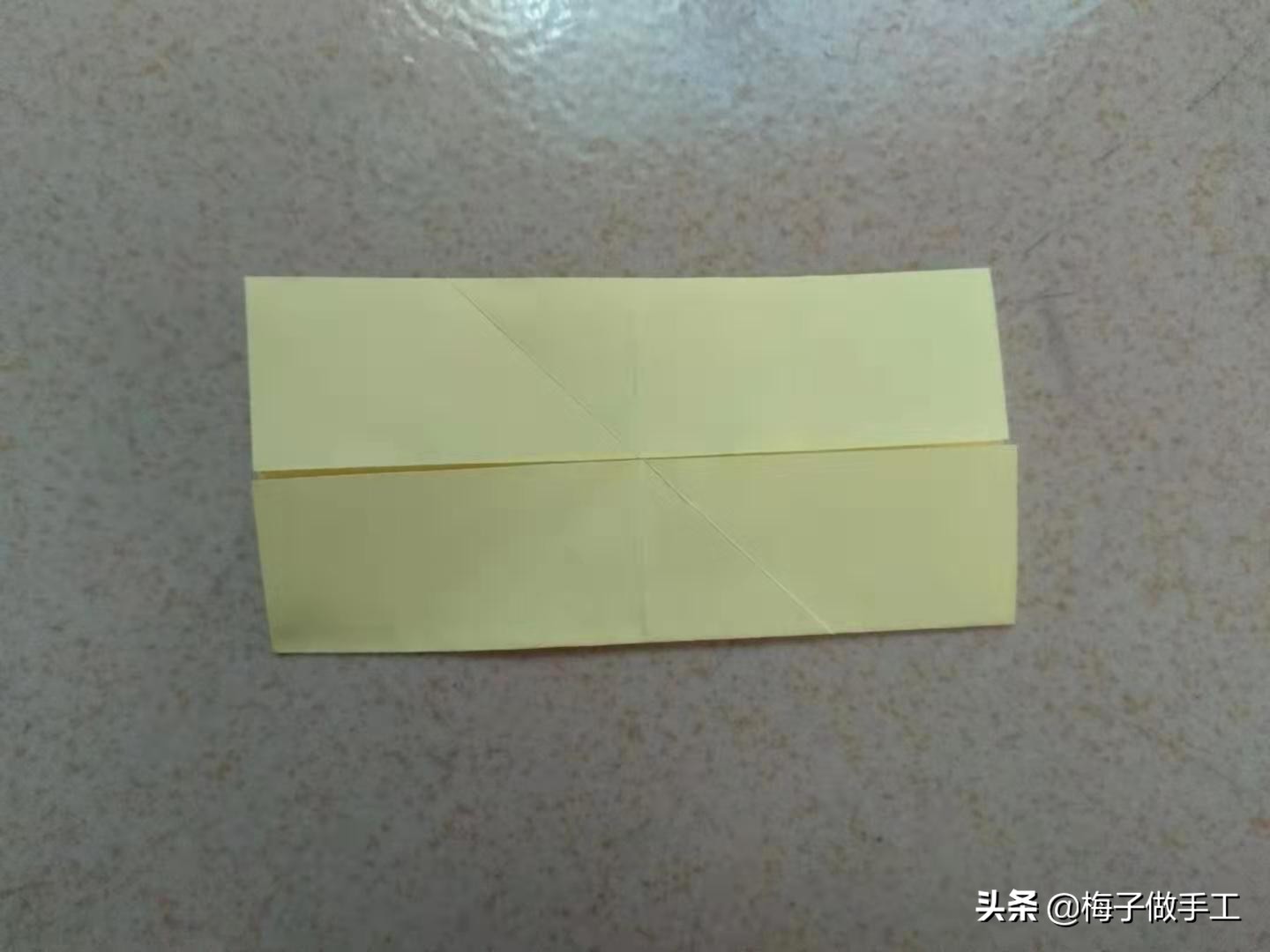 1、把一张正方形纸沿两条对角线对折,然后展开。