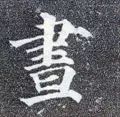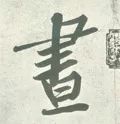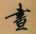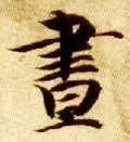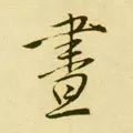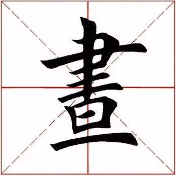 上部“聿”字整体抗肩,上展下收。横折露锋起笔,横画不要重,稍呈仰势,勿长,顿笔稍重,折靠下,竖笔左斜,上重下轻,不要长;第二笔长横注意起、收笔位置,抗肩,略呈俯势,畅朗舒展;底横起笔稍左探,收笔托住右竖。下面两横上短下长,上轻下重,注意间距比上面三横稍小;竖笔高起,垂直厚重,过底横后勿长。