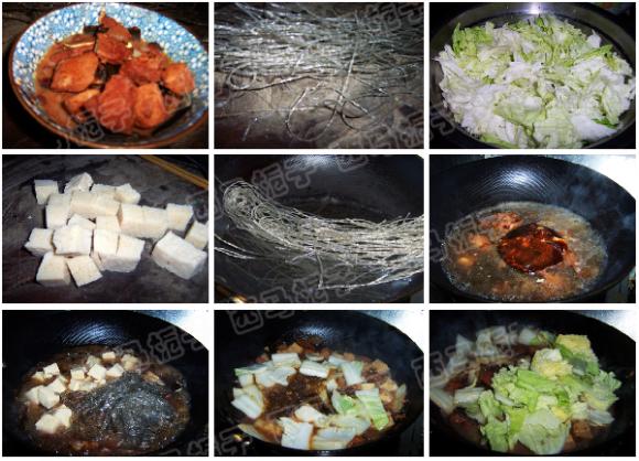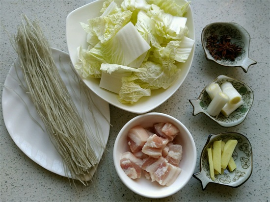 所需食材:大白菜、猪五花肉、粉条、葱、姜、干辣椒、冰糖、老抽、盐和五香粉、料酒