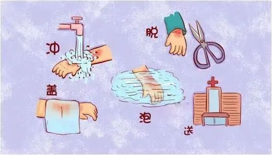 ❸在冷水中泡30分钟左右,并用干净毛巾覆盖烫伤部位,如感病情严重,及时送医救治。此步骤记牢5字诀“冲-脱-泡-盖-送”。