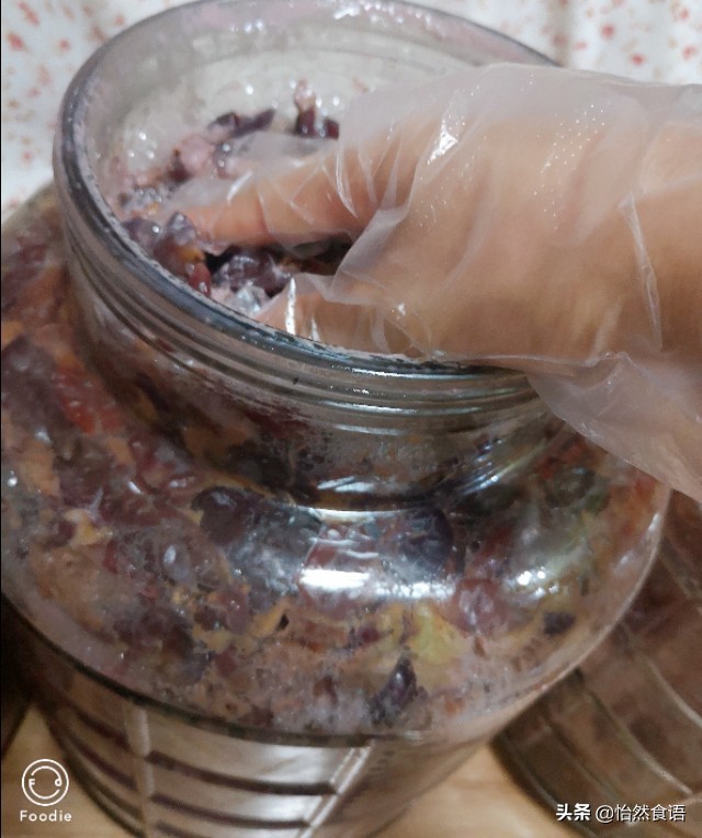 这一步完成之后,我们就可以把瓶口封紧,把罐子静置在比较暗的地方,等待发酵。发酵的过程,葡萄皮会浮在上面,职业会留在下面。我们每天用一次性食品级手套把浮在上面的葡萄皮压下去,因为这样可以使葡萄发酵均匀,并且可以阻止厌氧菌的生长。