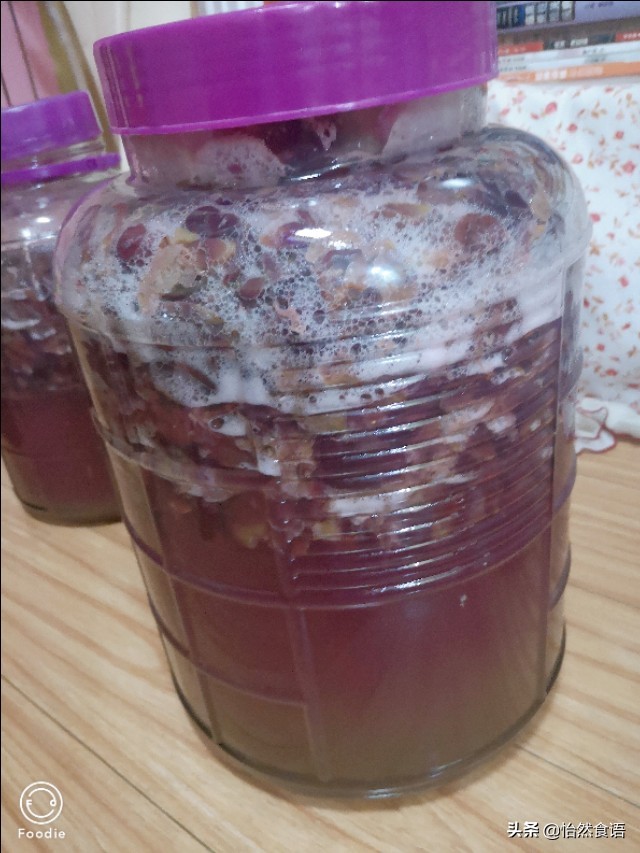 大家看上面的图就是葡萄发酵两天之后的样子,已经产生了许多泡沫。这时候就要注意把葡萄瓶子上面的盖子稍微松一下,不然汁液就会溢出来。