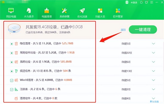 2、切换到【电脑清理】,选择【全面清理】,等到搜索垃圾完成,点击【一键清理】即可。