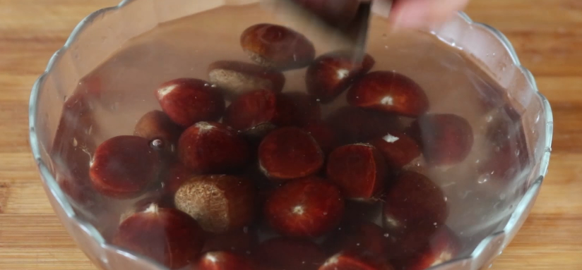 2、首先呢,咱们先把板栗放到一个大碗中,然后加入没过板栗的水,把板栗清洗一下,板栗表面是非常脏的,这一步一定要进行,板栗清洗干净之后,咱们先把它放到一个能够漏水的容器中给它稍微控一下水分。