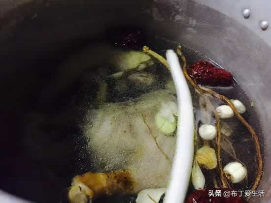 辅料:当归5克、党参5克、大枣3个、胡椒10粒、百合和白莲适量、老冰糖3粒、大葱1根、生姜5片。