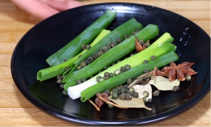 4、接下来再准备一个小盘中,在盘中放上咱们准备好的八角,香叶,大葱,花椒,都将它们放在盘中会方便后续的操作,接下来起锅烧油,将油烧热,然后放入所有的香料,在炸香料的时候火候不能太大,用小火慢慢炸,一直炸出香料的香味。
