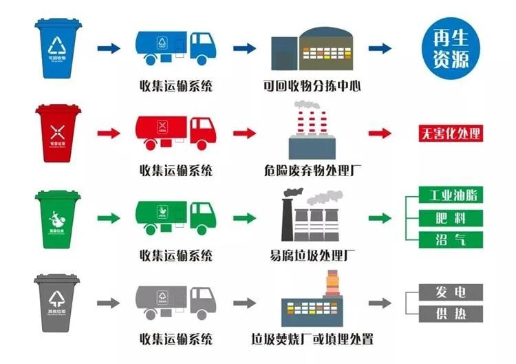 经过分类处理后无用的焚烧或填埋,变作肥料或分子可回收垃圾被二次加工利用,不可回收的垃圾根据种类的不同进行分类处理,处理的方法大概有两种:一种是卫生填埋,另一种就是高温焚烧。
