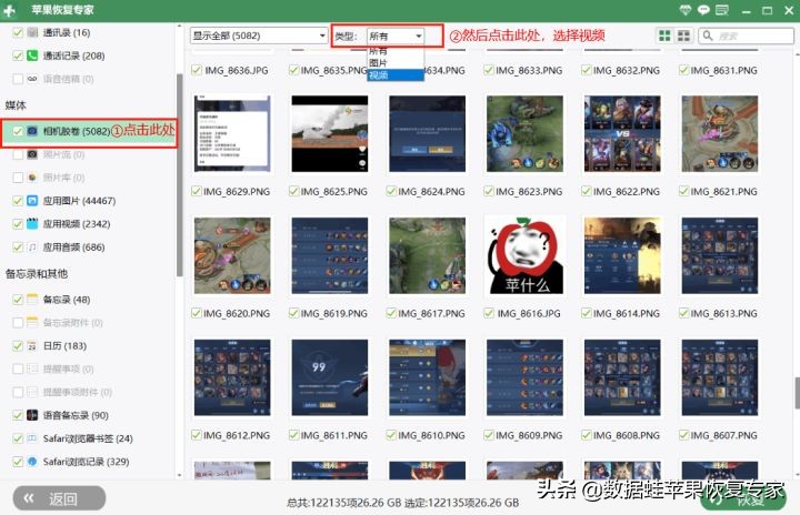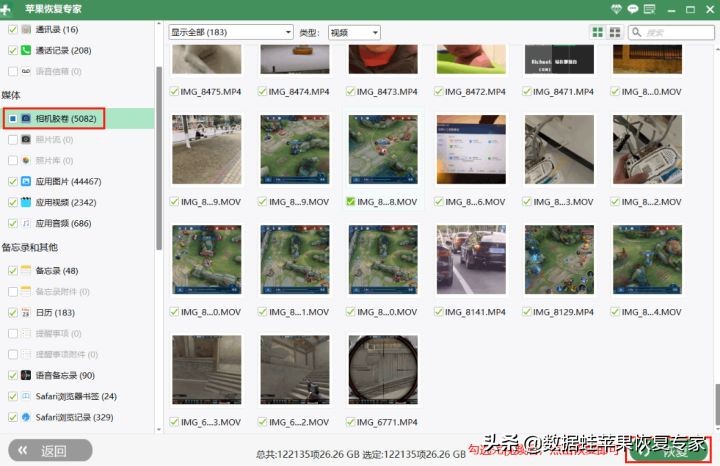 第3步:扫描完成以后我们找到【相机胶卷】后在【类型】中选择“视频”即可查看到自己手机中的视频及已删除的视频;