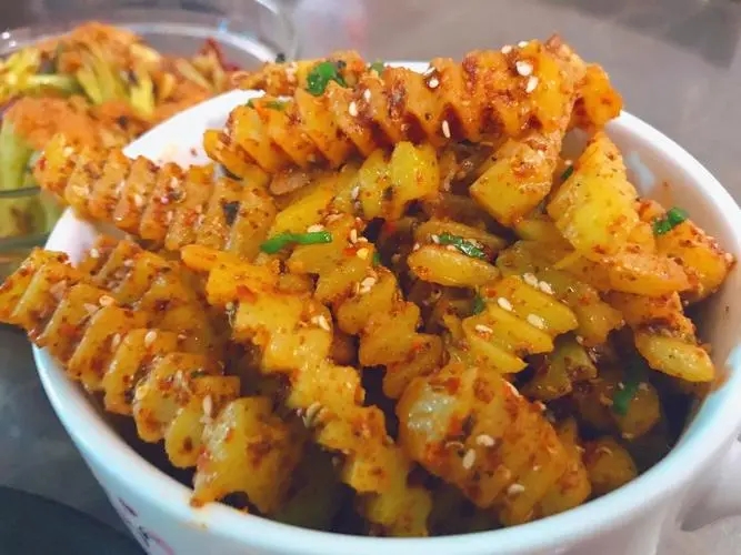 还记得以前我们上学时,经常吃路边摊卖的狼牙土豆吗?狼牙土豆更是大家逛街时,最受宠爱的美食之一。摊主会把土豆切成波浪条状,炸至金黄出锅,拌上摊主自制的各种风味蘸水,只需等待几分钟即可开吃,方便又美味。