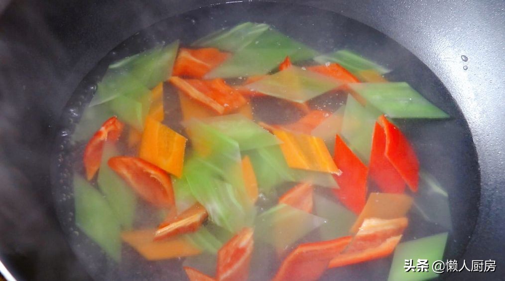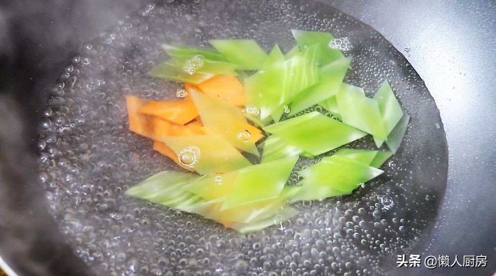 锅内倒水,水开后倒入莴笋片和胡萝卜片焯水。