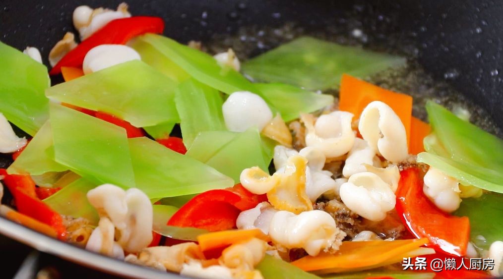 最后倒入鲍鱼片,给它推散开,等鲍鱼片变色后,即可将锅中的食材都捞出来。