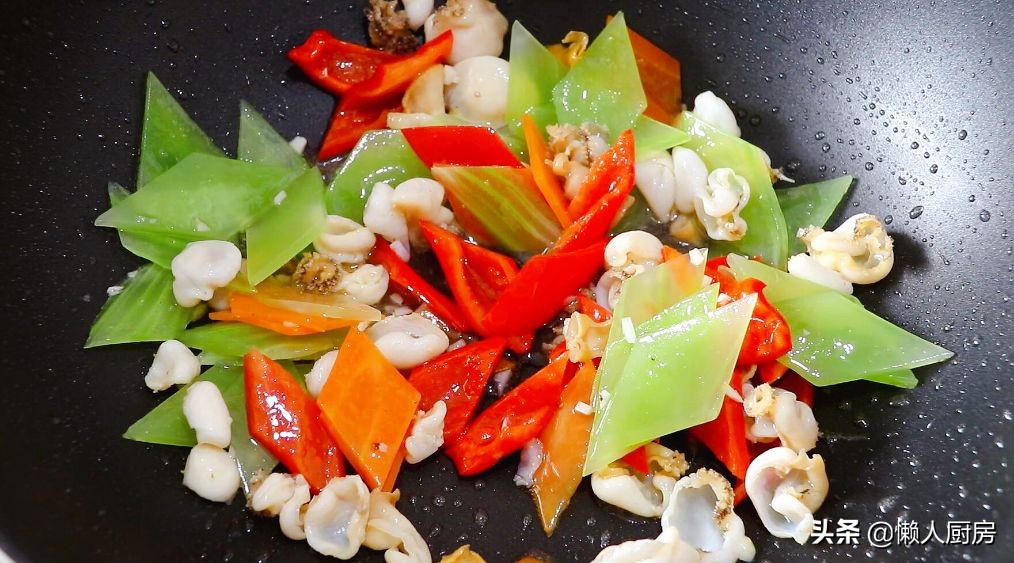 下焯过水的鲍鱼片、莴笋片、胡萝卜片、红椒片,快速翻炒均匀。