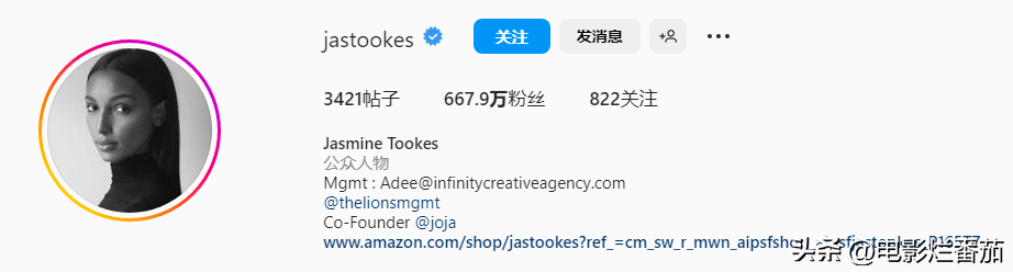 Jasmine Tookes是美国模特,她连续8年上榜,今年终于拿到第一名。