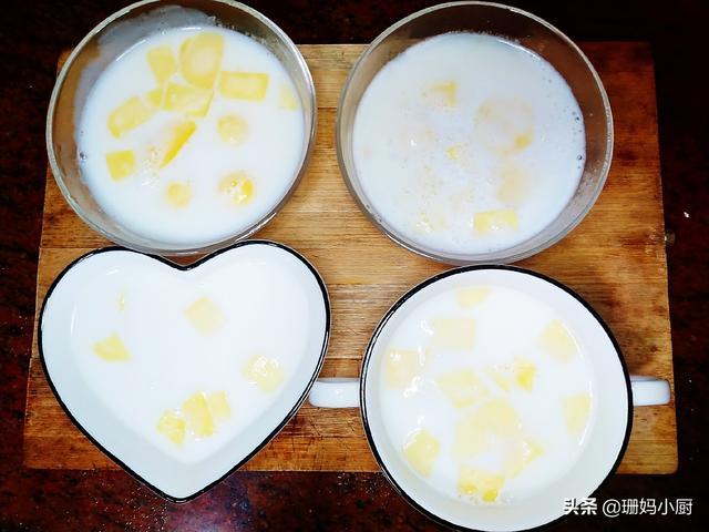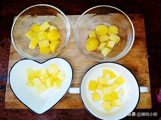【具体做法】:1、准备几个干净的容器,将芒果切开,把果肉切成小方粒,分别装在碗里。可以用大的容器,冷却后再切小块,用小容器,每人一碗也可以。