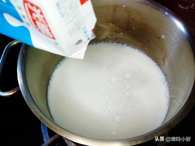 3、将牛奶倒入,搅拌圴匀并煮开。