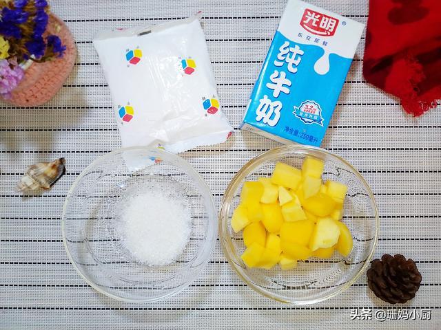 【准备食材】:白凉粉20克、纯牛奶250毫升、水250毫升、白砂糖30克、芒果1个。