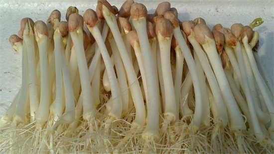然后均匀的放在花盆的沙子上面,覆盖3厘米左右的沙子,沙子保持湿润,盆或是桶放在见不到阳光的地方,一周左右,就会长出胖乎乎,嫩嫩的,很可口的花生芽了,挖出来后清洗感觉,做菜吃非常可口,炒菜很好吃的。