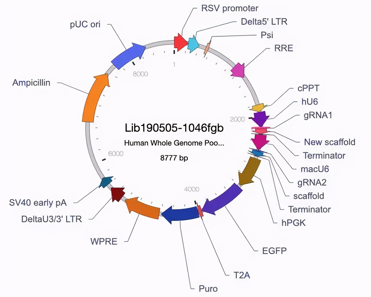 1、选择性敲除基因位置、细胞敲除载体构建: