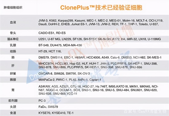 ClonePlus技术是整个敲除能加速的核心,能加快悬浮细胞的扩增周期:K562,THP-1等均适合。下图是ClonePlus技术测验过肿瘤细胞的类型供各位参阅: